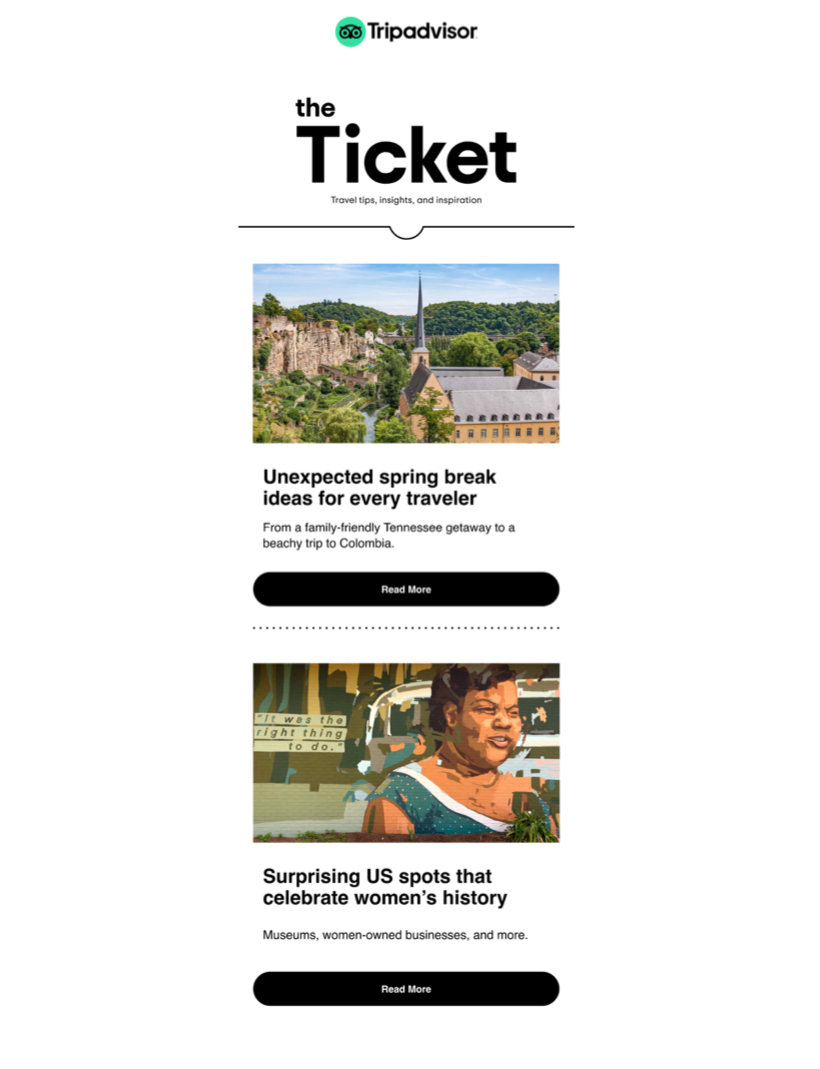 The Ticket consistently earned an open and click-through rate above 30%, and attracted sponsorships from Hertz, the Palm Beach Tourism Bureau, and more, making it one of the most successful newsletters in Tripadvisor’s email slate.